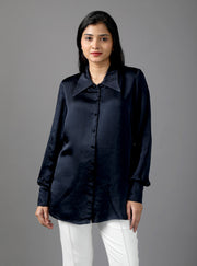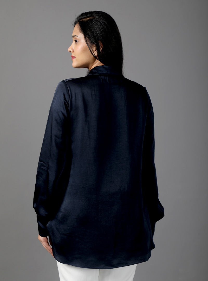 Navy blue relaxed fit shirt with self fabric cover buttons and shirt collar